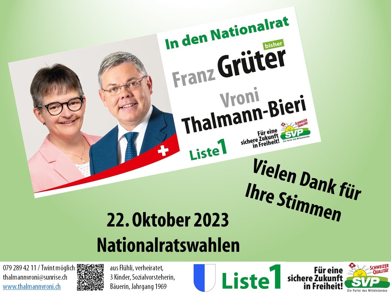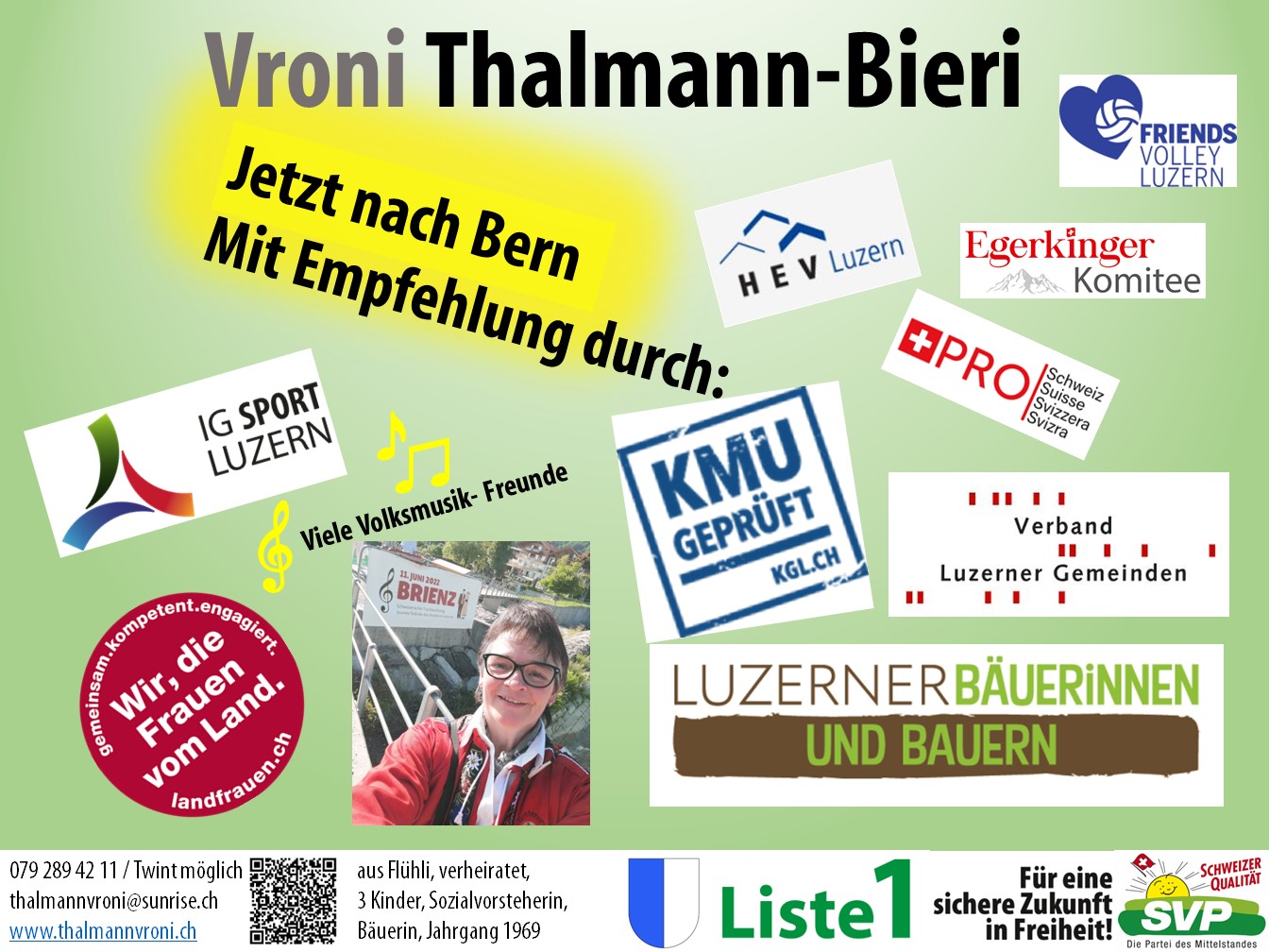 Nachdem ich nun bald 20 Jahre das Amt als Sozialvorsteherin der Gemeinde Flühli-Sörenberg innehabe und im Kantonsrat seit 16 Jahre treue Dienste im Namen der SVP leiste, ist es an der Zeit, für den Nationalrat zu kandidieren. Dort will ich vor allem meine Erfahrungen als Sozialvorsteherin und Kantonsrätin einbringen. Arbeitsintegration statt Arbeitslosigkeit oder auch freiwilligen Arbeit für Sozialhilfebezüger, die keiner Arbeit nachgehen können