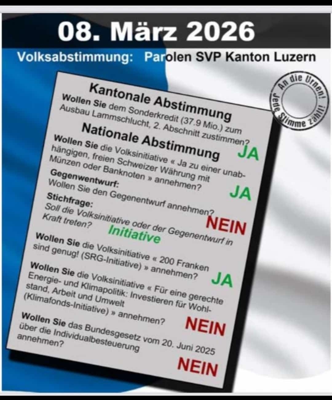 Es sind ganz viele Abstimmungen an der Urne, die sehr wichtig sind, damit die Schweiz auch Schweiz bleibt.